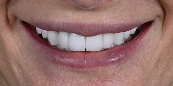 Výmena starého kovokeramického mostíka za úplne nový zirkónový mostík vo farbe B1. Rekonštrukcii predchádzalo kompletné endodontické ošetrenie a príprava zubov na protetickú prácu zahrňujúca aj dostavby.
